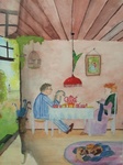 1974Romantish tafreel van huis en haard dat ik schilderde in mijn tienerjaren (zeventiger jaren). Later had ik zelf twee rode katten en een bruin hondje en zo'n lamp boven de tafel... Maar geen paraplubak....gelukkig.